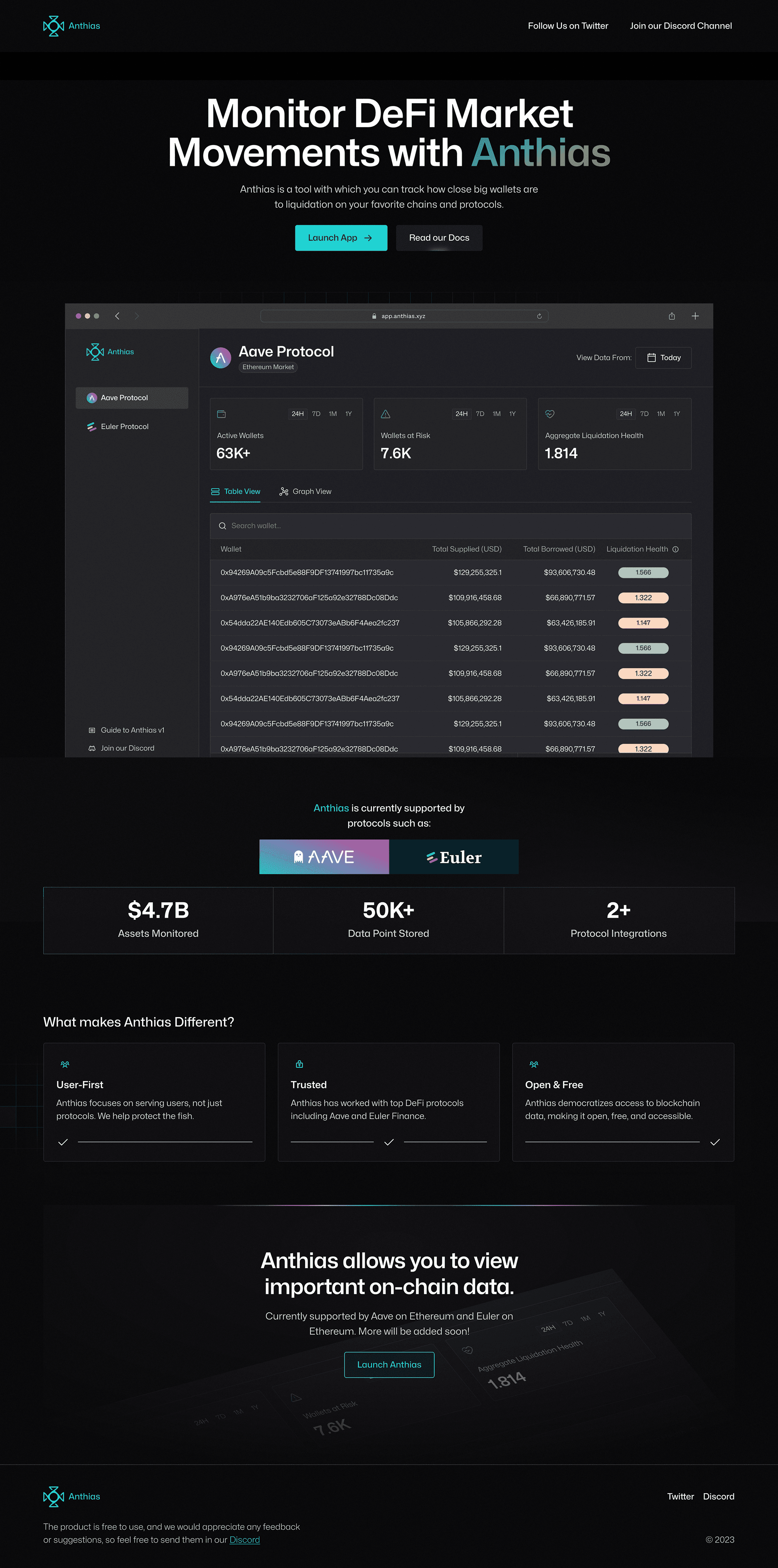 Anthias is a tool to track how close big wallets are to liquidation on your favourite chains and protocols. I redesigned the page to give it a polished look and establish a coherence in design between the landing page and product page